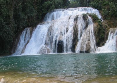 Desayuno. Siguiendo un paisaje sinuoso y túpida vegetación llegaremos al río Yaxhá (Agua Azul) para disfrutar las impresionantes Cascadas de Agua  Azul, el color azul añil del agua, el verde de la vegetación, la brisa, el sonido inagotable… convierten a este lugar en uno de los más espectaculares e inolvidables de México. Comida. En otro ambiente natural de selva tropical y refrescante paisaje disfrutaremos de la hermosa Cascada Misol há. Continuación a Palenque. Alojamiento Hotel.
