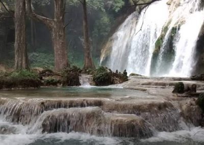 Desayuno en trayecto. Siguiendo un paisaje sinuoso y túpida vegetación llegaremos al río Yaxhá (Agua Azul) para disfrutar las impresionantes Cascadas de Agua Azul, el color azul añil del agua, el verde de la vegetación, la brisa, el sonido inagotable… convierten a este lugar en uno de los más espectaculares e inolvidables de México. Comida. En otro ambiente natural de selva tropical y refrescante paisaje disfrutaremos de la hermosa Cascada Misol há. Continuación a Palenque. Alojamiento.